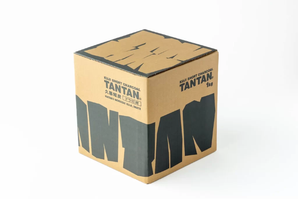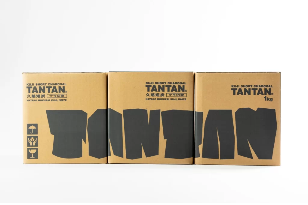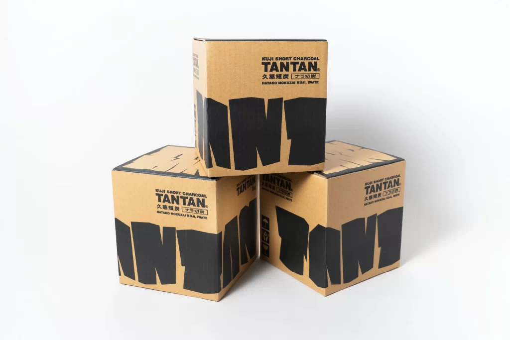 岩手県久慈市で林業、製炭業を行う有限会社畑光木材さまの オリジナル商品のネーミング、パッケージデザイン。本商品は規格サイズよりも短い木炭を使用していることから「短(い)炭=TANTAN」とキャッチーなネーミングをつけました。パッケージデザインは木炭をイメージしたロゴマークを全面にあしらい、箱を並べるとロゴマークになるデザインになっています。